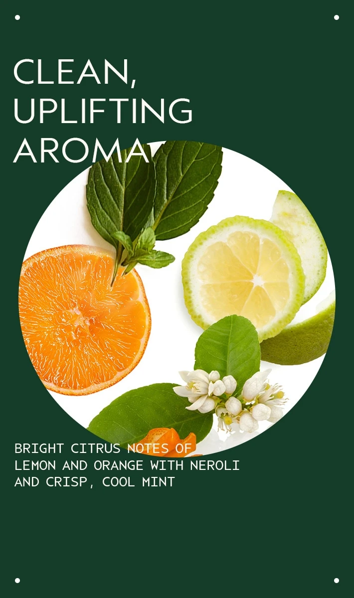 A clean, uplifting aroma with bright citrus notes of lemon and orange on a light floral heart of neroli, balanced by delicate hints of crisp, cool mint.