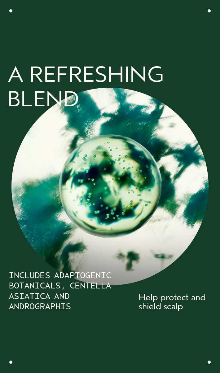 A blend of adaptogenic botanicals, Centella Asiatica and Andrographis, combined with Vitamin E, Resveratrol and Rosemary and Ginger Extracts help protect and shield the scalp from pollution, oxidative stressors and environmental aggressors.