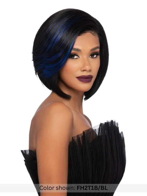 - 10″ layered angled bob w/ feathered side bang.