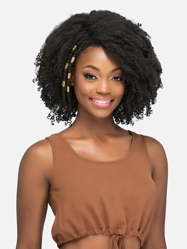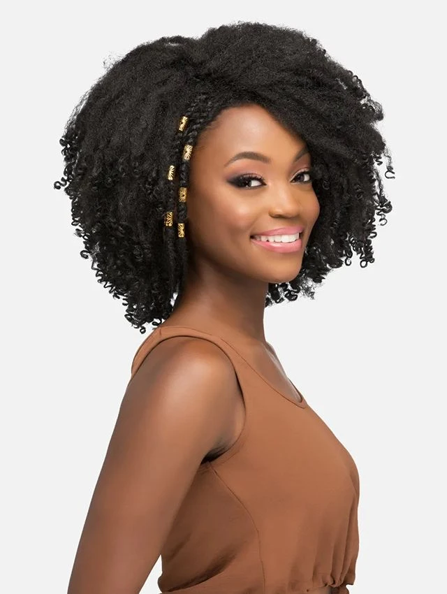 - 12″ tight curl brushed out and layered afro tight curled end with cornrow side.